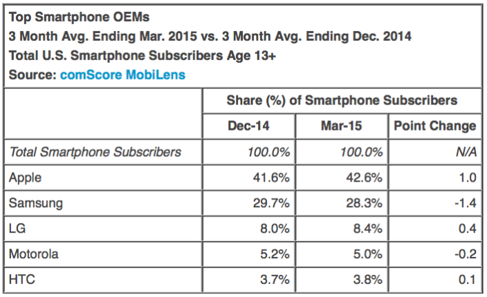 ComScore ha riportato in una tabella le percentuali degli smartphone adottati in USA. Nella tabella si può notare come il vantaggio di Apple sulle altre aziende sia leggermente aumentato.