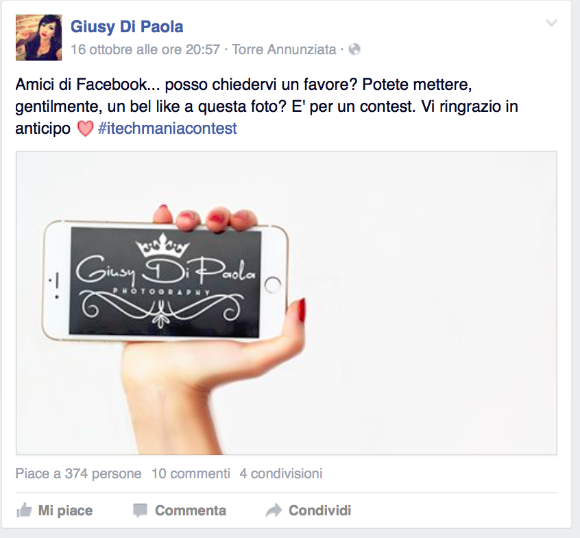 3 Fate una foto al vostro oggetto tecnologico preferito (non necessariamente un prodotto Apple) e pubblicatela su Facebook o su Twitter con #itechmaniacontest, è importante che sia pubblicata sul vostro profilo con privacy pubblica e non in gruppi chiusi, perché non saremo in grado di vederla. la foto che riceve più like o condivisioni su Face o più retweet su twitter vincerà le cuffie. Per quanto riguarda Facebook ovviamente le condivisioni valgono doppio, 1 punto per like, 2 punti per condivisione.